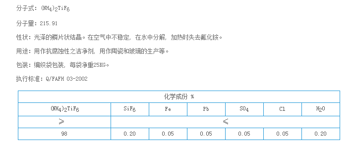 分子式:(NH4)2TiF6分子量:215.91性狀:光澤的鱗片狀結晶。在空氣中不穩定, 在水中分解, 加熱時(shí)失去氟化銨。用途:用作抗腐蝕性之潔凈劑, 用作陶瓷和玻璃的生產(chǎn)等。...