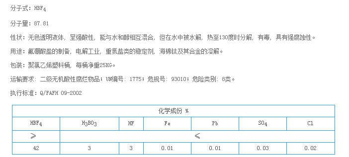 分子式:HBF4分子量:87.81性狀:無色透明液體, 呈強酸性, 能與水和醇相互混合, 但在水中被水解, 熱至130度時分解, 有毒, 具有強腐蝕性。用途:氟硼酸鹽的制備, 電解工業(yè), 重氮鹽類的穩(wěn)定...